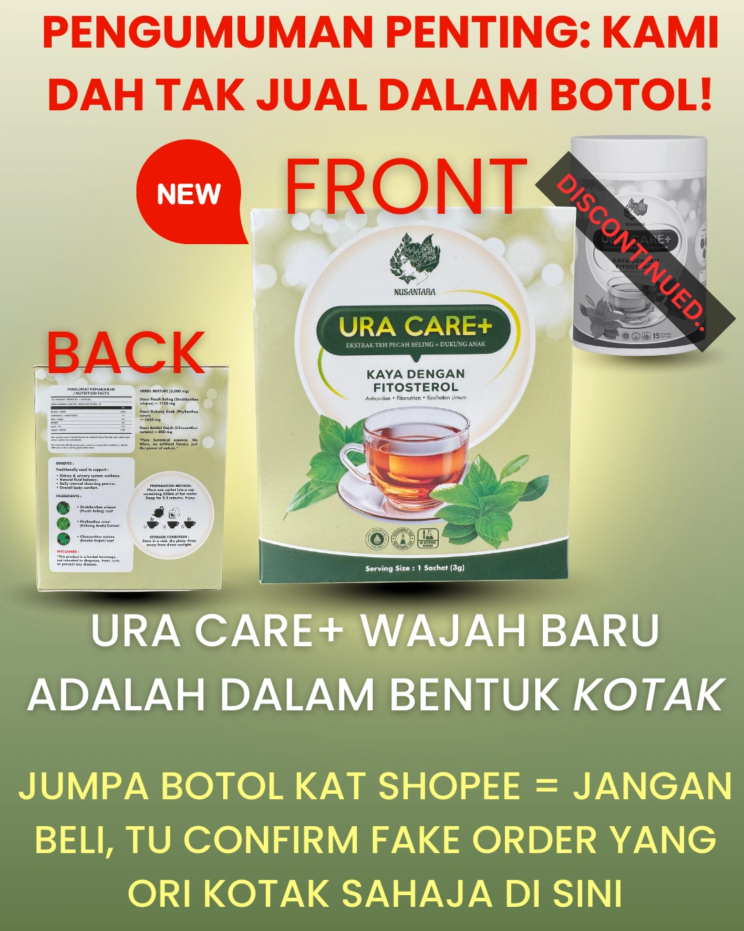 Tolong jangan gadai buah pinggang korang semata-mata nak jimat RM5-RM10.Pihak HQ nak tegaskan bahawa Ura Care+ (Packaging Kotak) HANYA dijual secara rasmi di laman web ini sahaja.